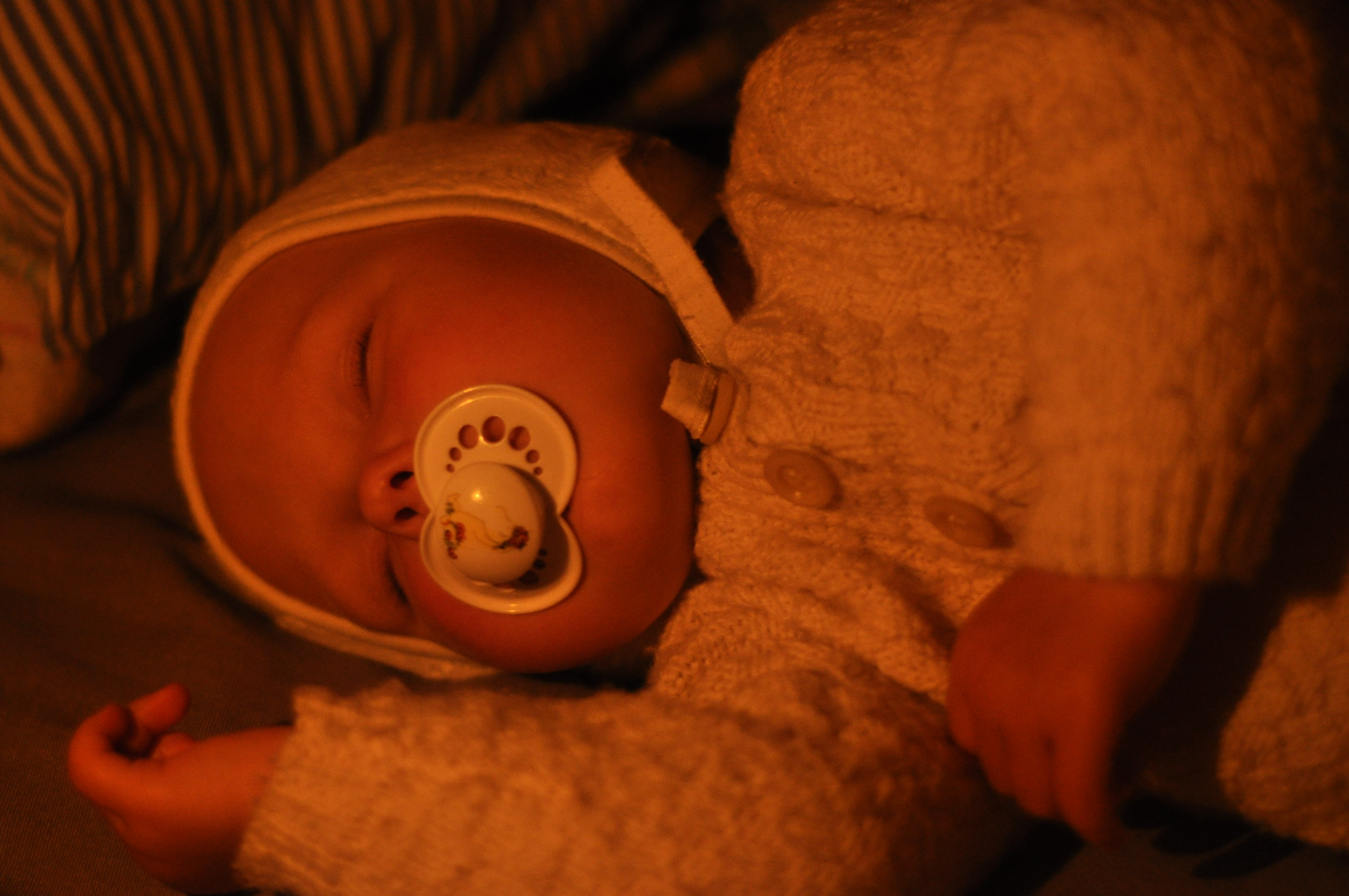Och plötsligt samma dag blev det kväll. Här är Freja i sin sovutstyrsel.