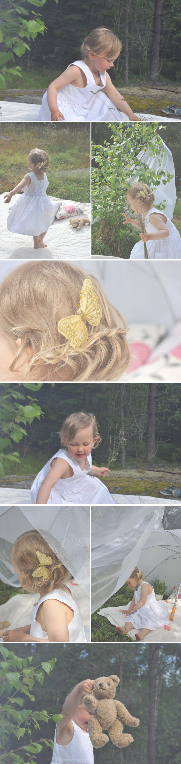 I brist på bättre berså byggde vi en myshörna i trädgården åt Freja av en filt, några kuddar och lite tyll. Dagens outfit är en klänning av det italienska märket c’era una volta.