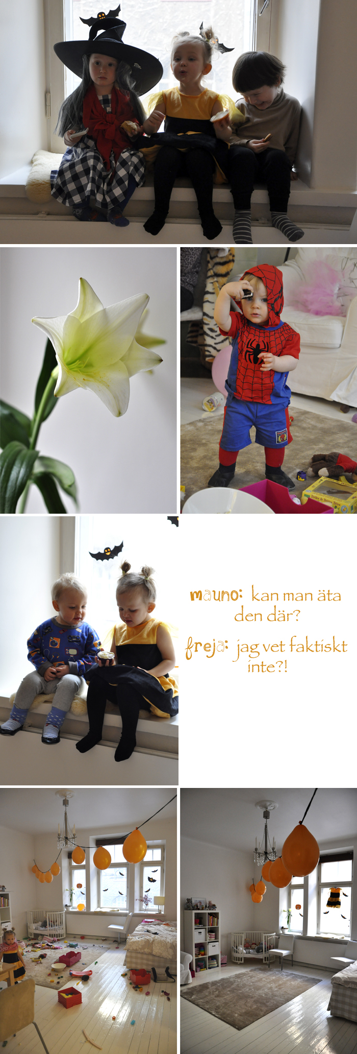 Fullt hus hemma hos oss på fredagen. Fastän fester är hur roliga som helst slog vi två flugor i en smäll och hade en kombinerad Halloweenmaskerad och inflyttningsfest för Frejas vänner. Jag behöver inte säga hur söta våra små gäster var i sina fina dräkter. På plats fanns det en häxa, två tigrar, en spindelman och en Blixten McQueen rallyförare.