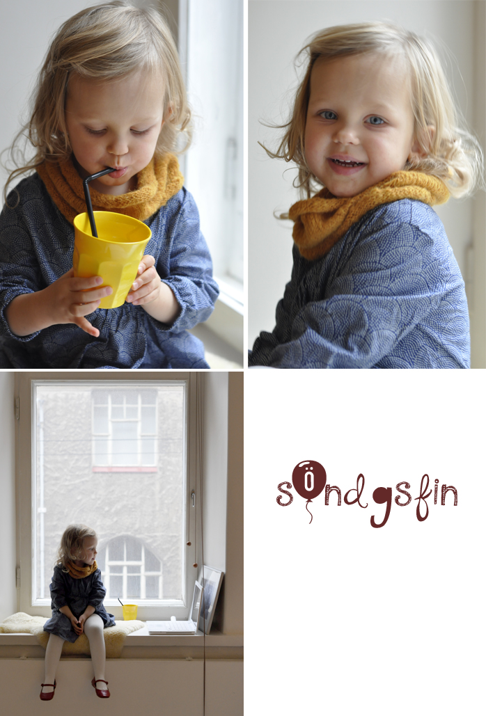 Vi klädde oss lite extra fint igår, söndagen till ära. Freja ville sätta på sig ett par röda finskor. Jag fick klart ett mindre stickprojekt, en tubhalsduk, och Freja fick den runt halsen.
