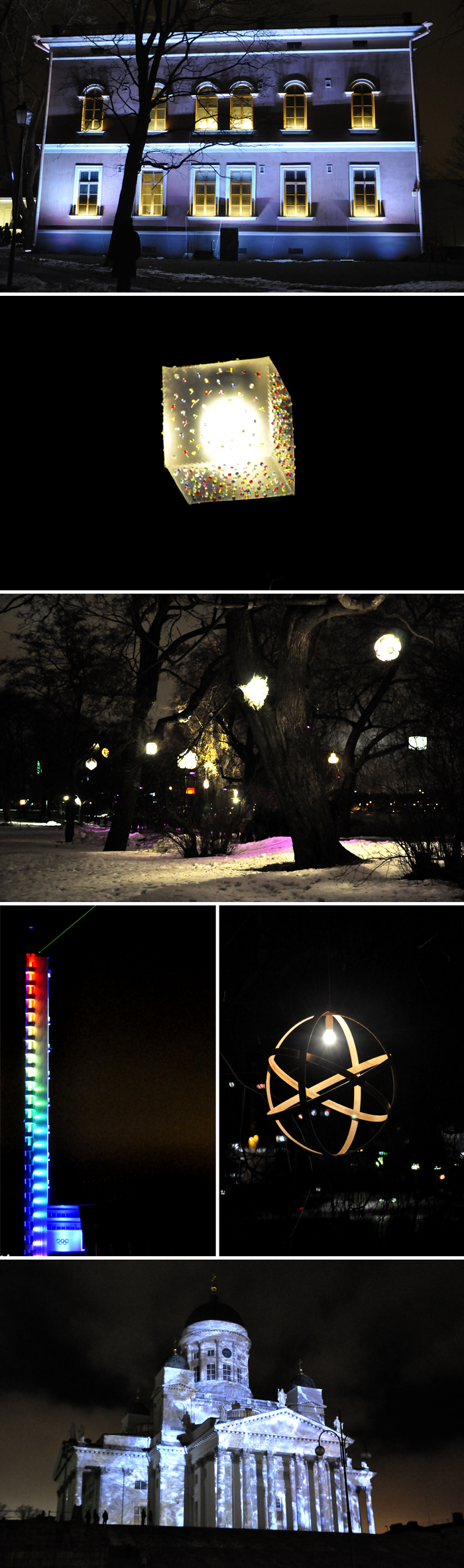 Det pågår som bäst ett ljusevenemang, Lux Helsinki, i stan. Idag gick jag på en kvällspromenad för att se ljusverken. Jag var inte den enda med kamera. Var och varannan bar också på stativ, jag skulle ha varit i behov av ett. Men här bjuder jag ändå på några bilder.