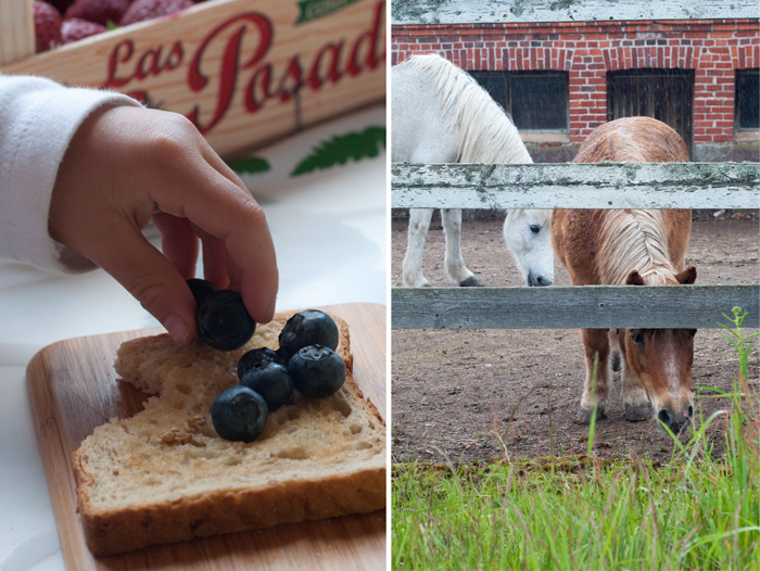 Freja testar blåbär på rostbröd. Finaste hästarna Stormis och Adela.