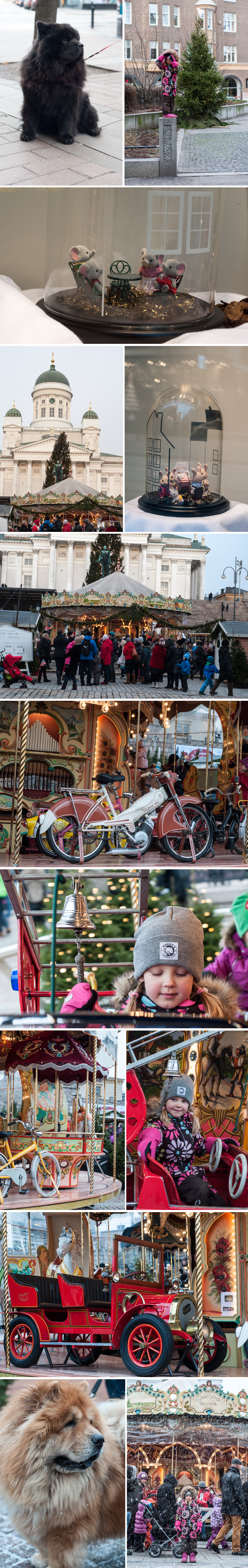 Sista varven i karusellen på Senatstorget åkte vi på söndagen. I skyltfönstren såg vi de välbekanta djurfigurerna fira jul och hundar av olika färg men samma ras mötte vi också på vägen till karusellen.